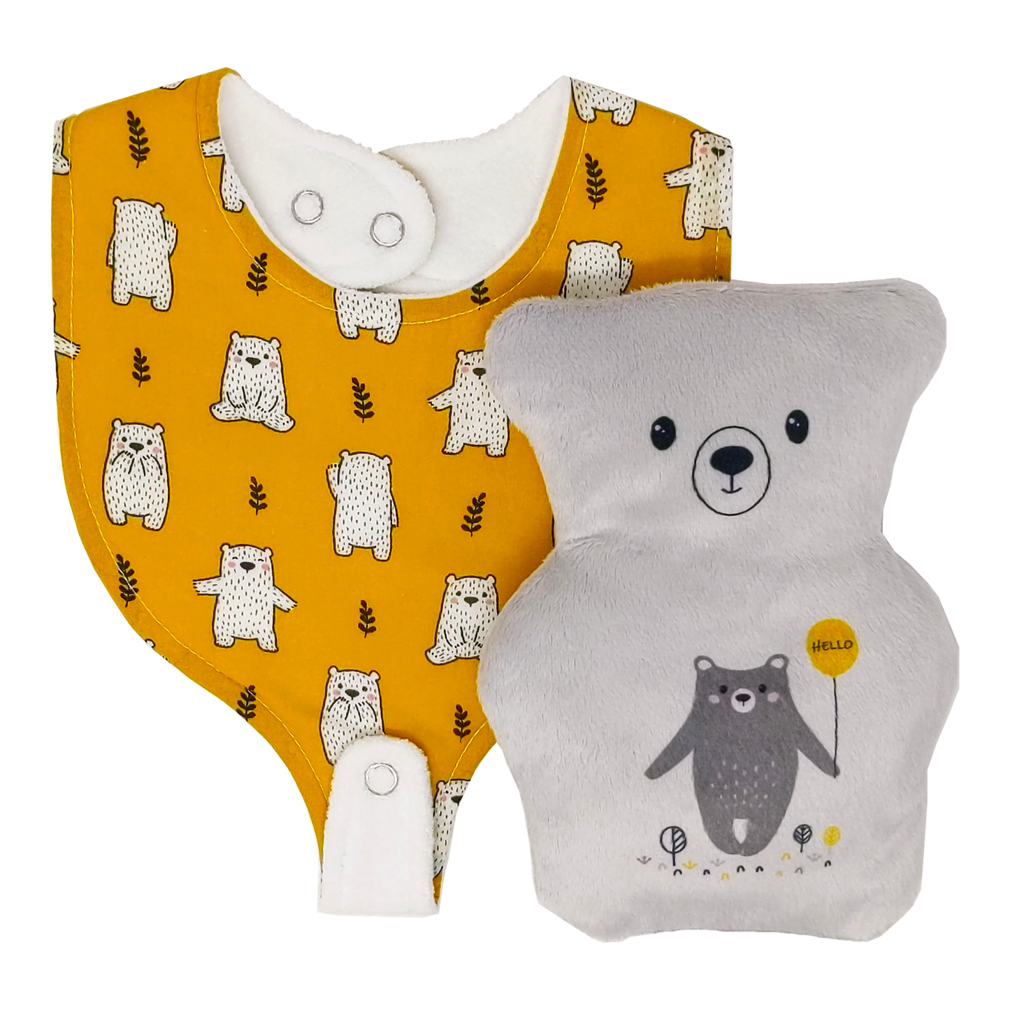 Our lovely teething set features two must-haves for baby: a lovely teething bib and a small therapeutic teddy bear that heals all booboos.