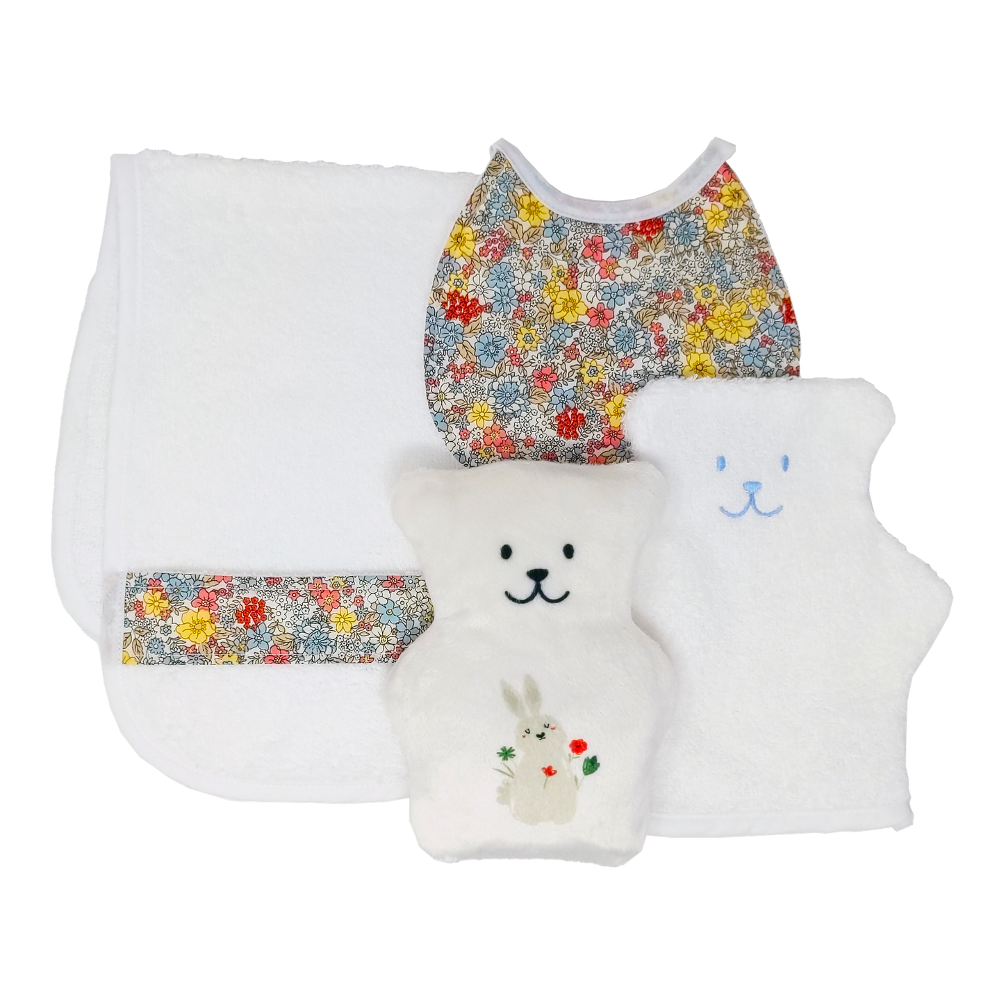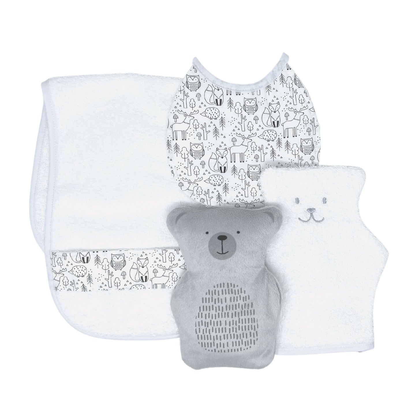 ¿Estás buscando un set de regalo para recién nacido? Béké-Bobo ofrece un práctico y monísimo set que incluye un paño eructador, un babero muy absorbente, una toallita con forma de oso y un pequeño oso terapéutico.
